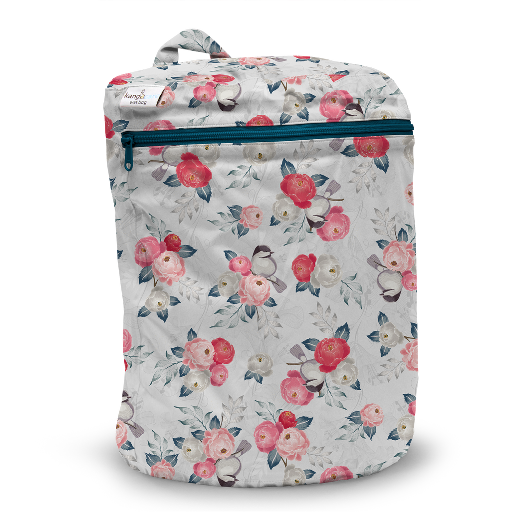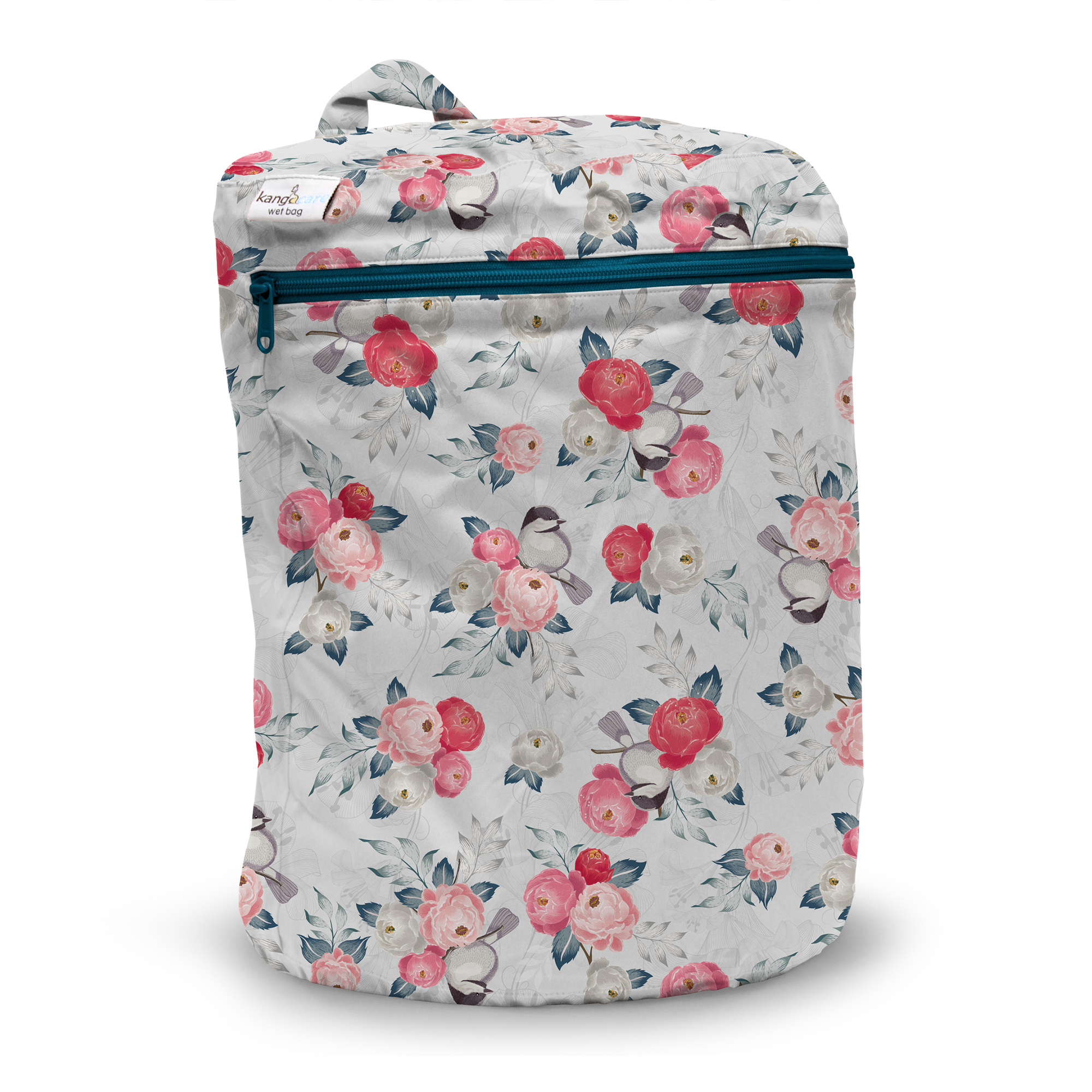 Here's Lily - A floral pattern introduced in 2019 with Billy, to make a cute couple of Rumparooz cloth diapers! Kanga Care Wet Bags are a standard size wet bag, except instead of being flat (like an envelope), they are HALF MOON shaped to allow more volume. This design is EXCLUSIVE to Kanga Care. This wet bag will hold up to 12 to 15 diapers and inserts. The Kanga Care Wet Bags have color matching, heavy duty zippers that are easy to grab. The zipper is placed on the front so the top of the bag functions as a lid. There is a strap on top that can be opened by an industrial strength snap so that the bag can be attached to a stroller handle, door knob, or other ideal hanging place. To clean, machine wash with your diapers or other soiled items. Tumble dry low or hang dry. Visit www.kangacare.com for further information. Kanga Care uses a water resistant polyester TPU which is solvent-free polyester fabric that has been laminated with a thermoplastic polyurethane using a heat bonding process, not chemicals. This process is low in toxicity and is better for the natural environment then traditional PUL.