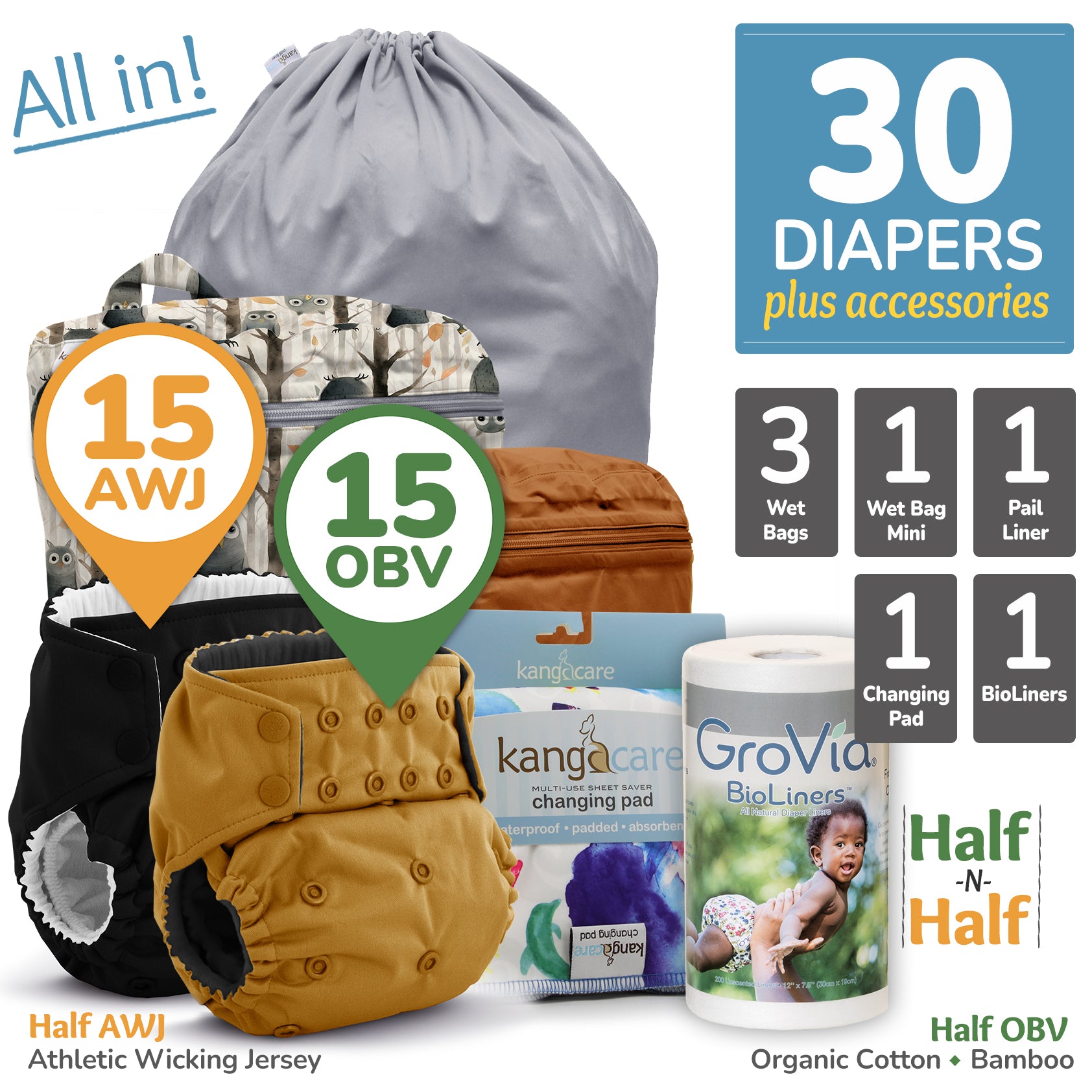 Congratulations on your decision to cloth diaper! The All in Rumparooz G3 AWJ + OBV Organic Bundle comes with everything that you need to cloth diaper your child from birth to potty training. Buy in BULK and SAVE $$$ with Kanga Care Bundles! You choose any in-stock prints / colors to make up your perfect bundle!