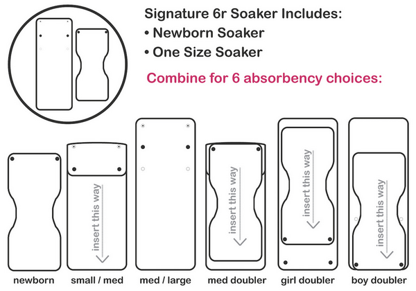 Multiple sets of 6r Soakers allows you to double-up (or triple) the same size insert piece, or try many other combinations, for 7, 10, 14... and MORE absorbency levels of 170+ setting options. Examples: