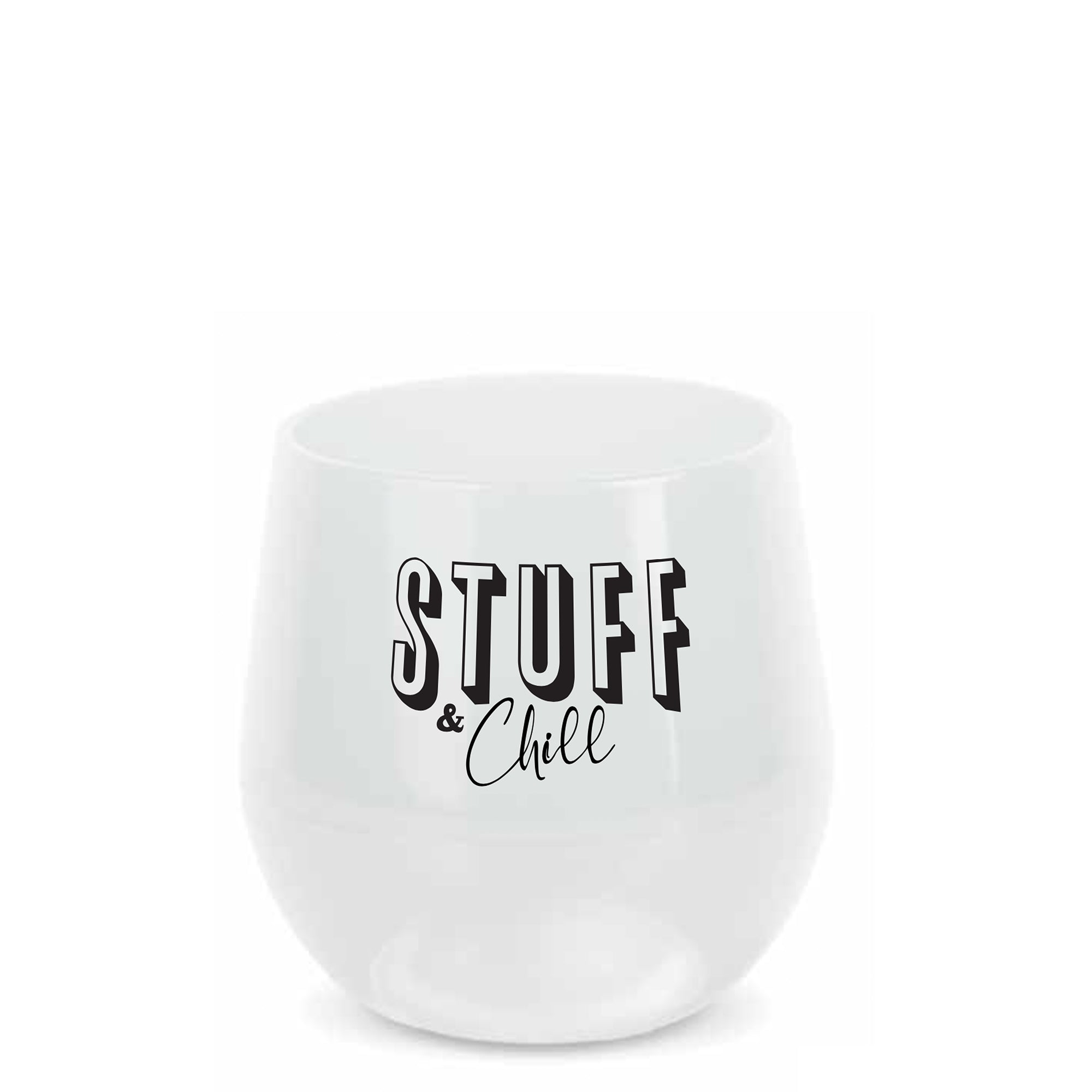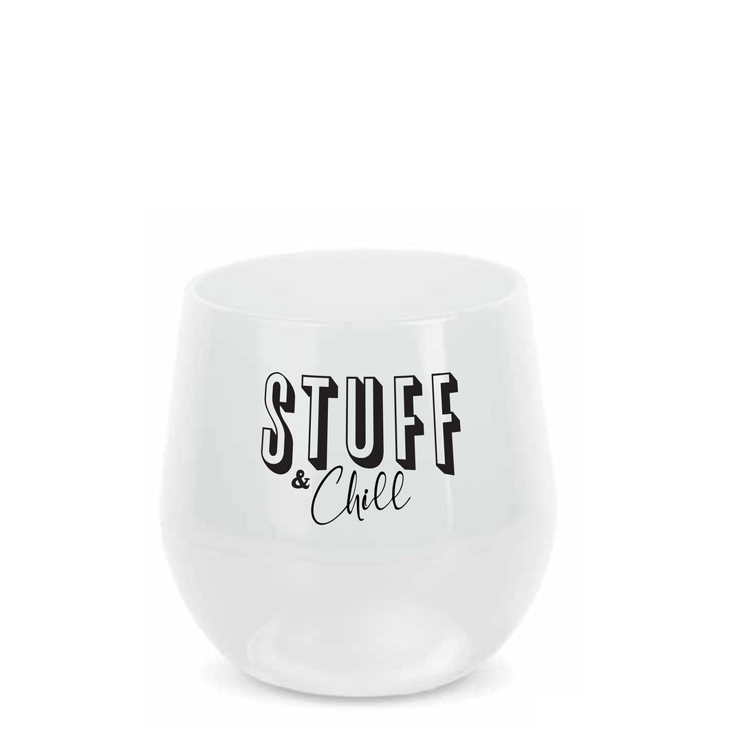 Frosted white SiliPint sillicone wine tumbler - 14oz. Stuff & Chill (front) - Keep it Fluffy (back).